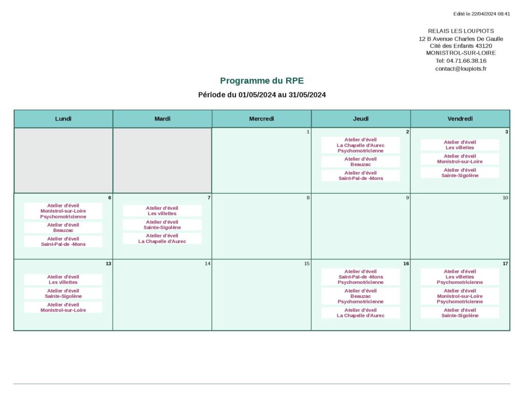 Bonjour à toutes, veuillez trouver le planning pour le mois de mai !