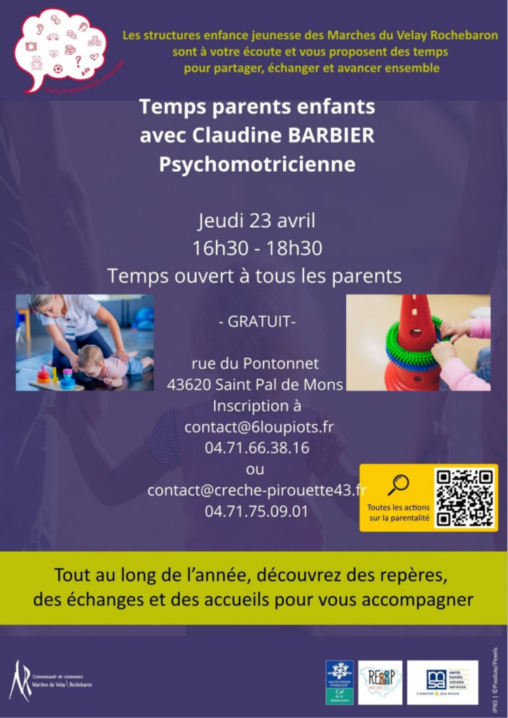 Nous avons le plaisir de vous accueillir jeudi 23 avril de 16h30 à 18h30 au relais petite enfance de Saint Pal de Mons, pour un moment de jeux et d’échanges avec Claudine BARBIER psychomotricienne.